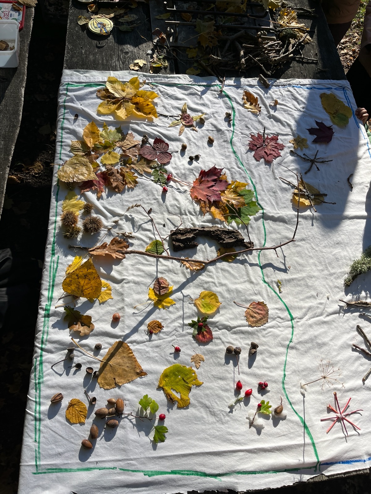 Vi delade in oss i grupper, för att leta efter saker vi skulle göra ett ” konstverk ” av. Pinnar blev till stjärnor, blad till blommor, skal från äkta kastanj blev till igelkottar. Vi limmade fast detta på en bit tyg.